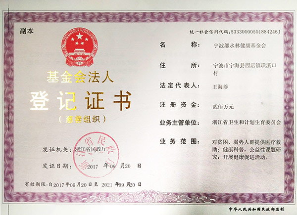 宁波邬永林健康基金会,成立于2010年10月,是在浙江省民政厅注册、由浙江省卫生健康委主管的非公募基金会。基金会的原始基金数额为人民币贰佰万元,来源于开云官方注册。《慈善法》颁布后,本基金会被认定为慈善组织。